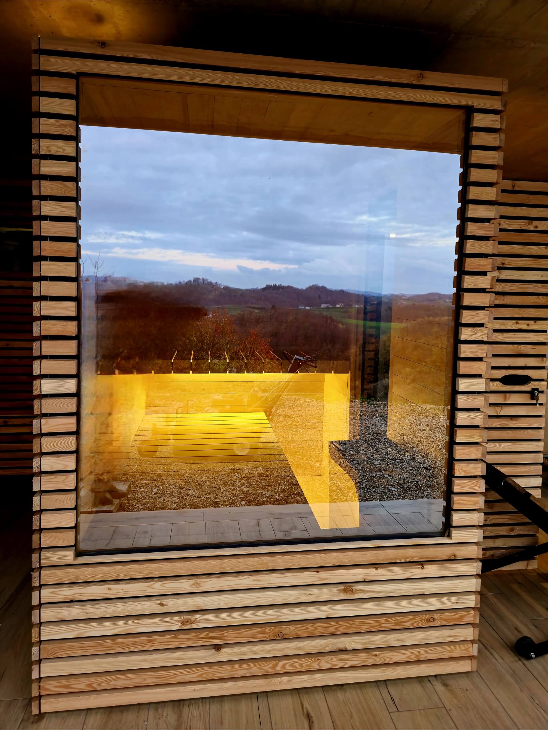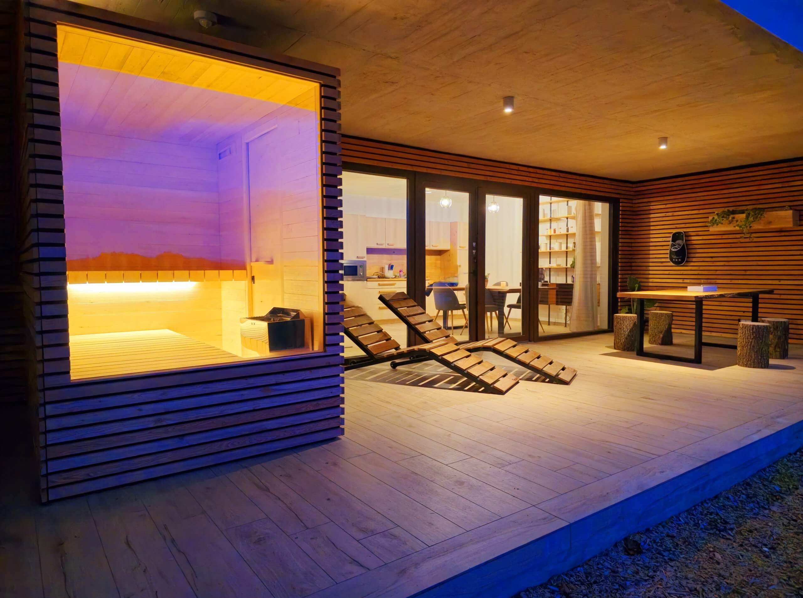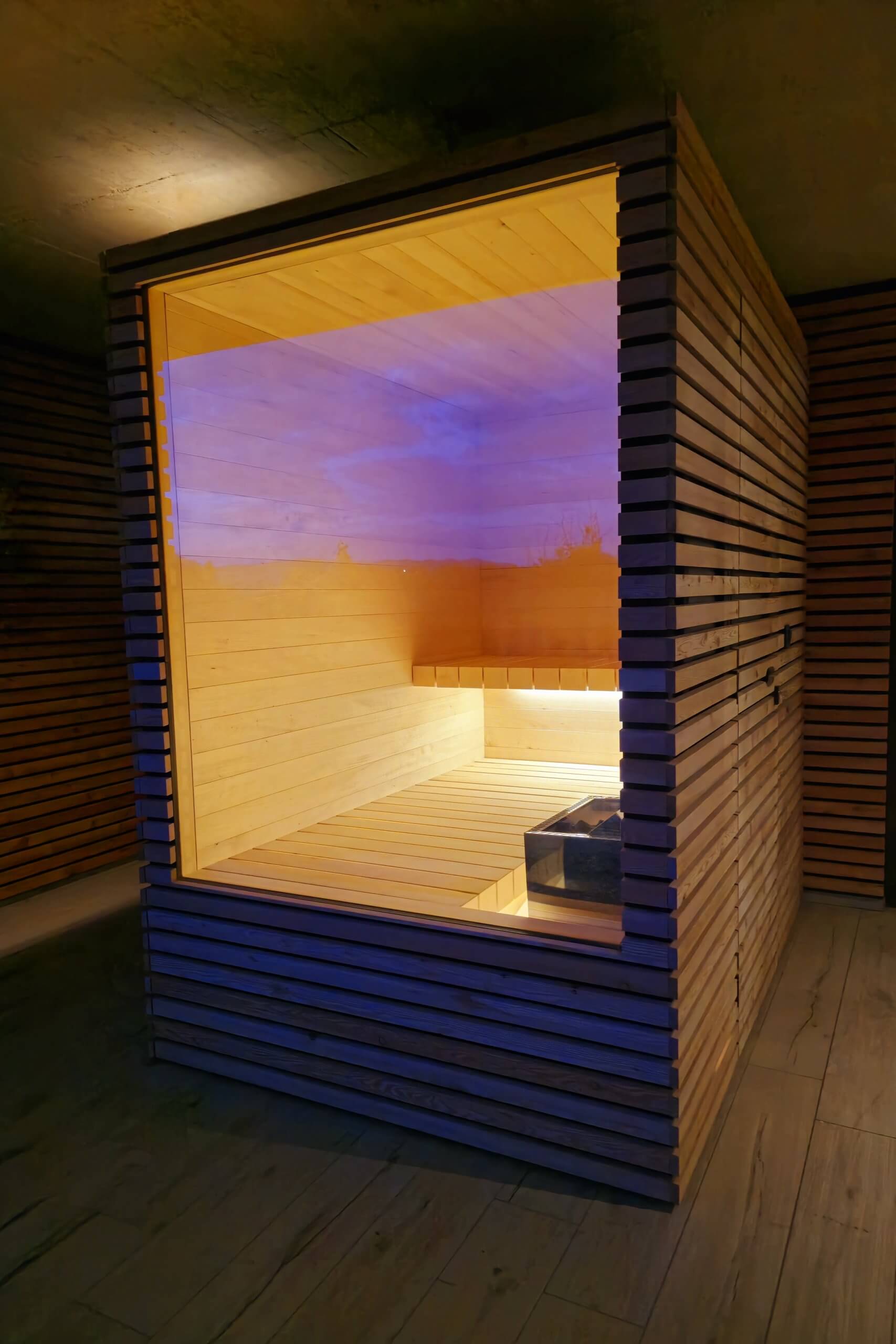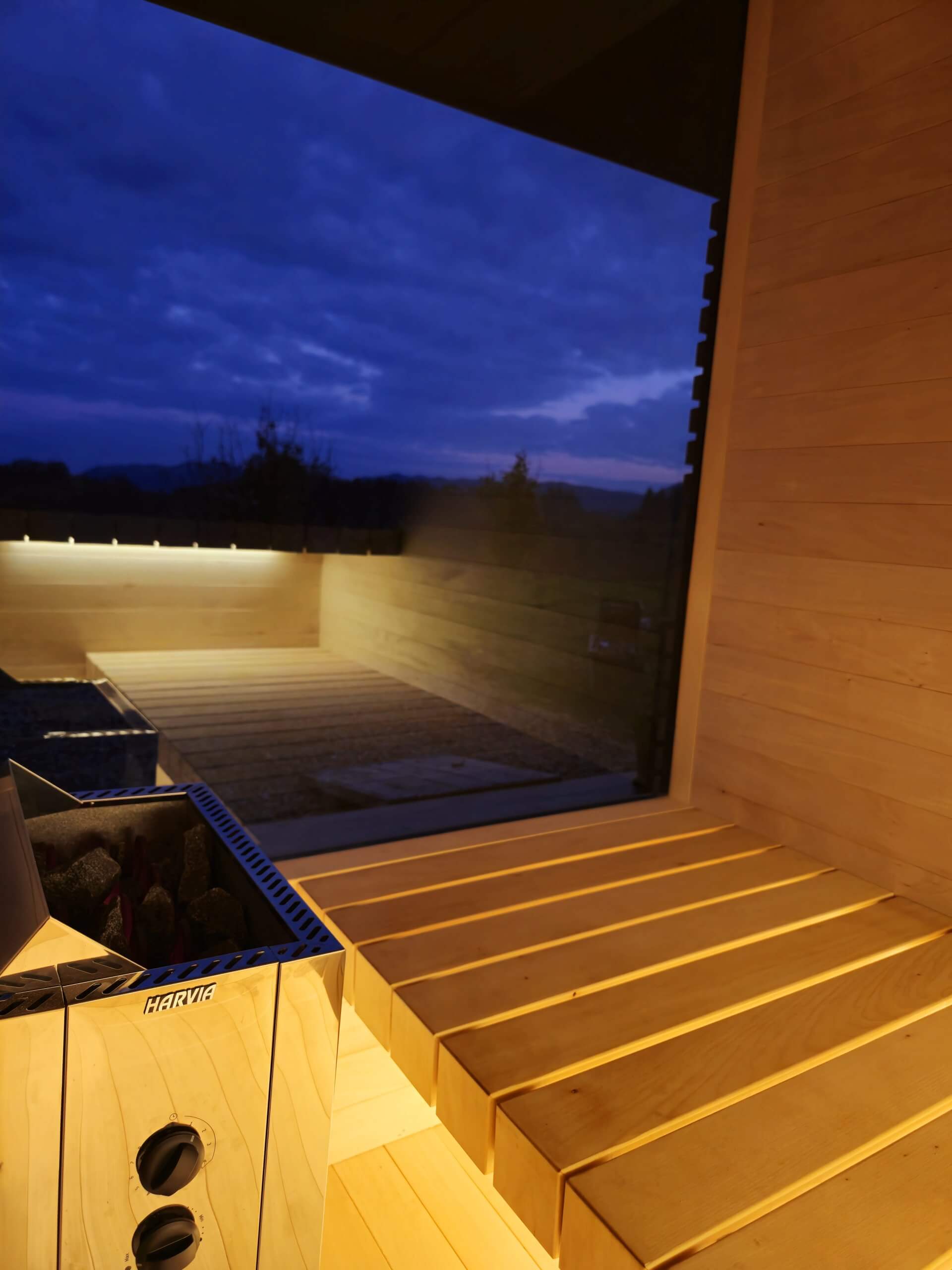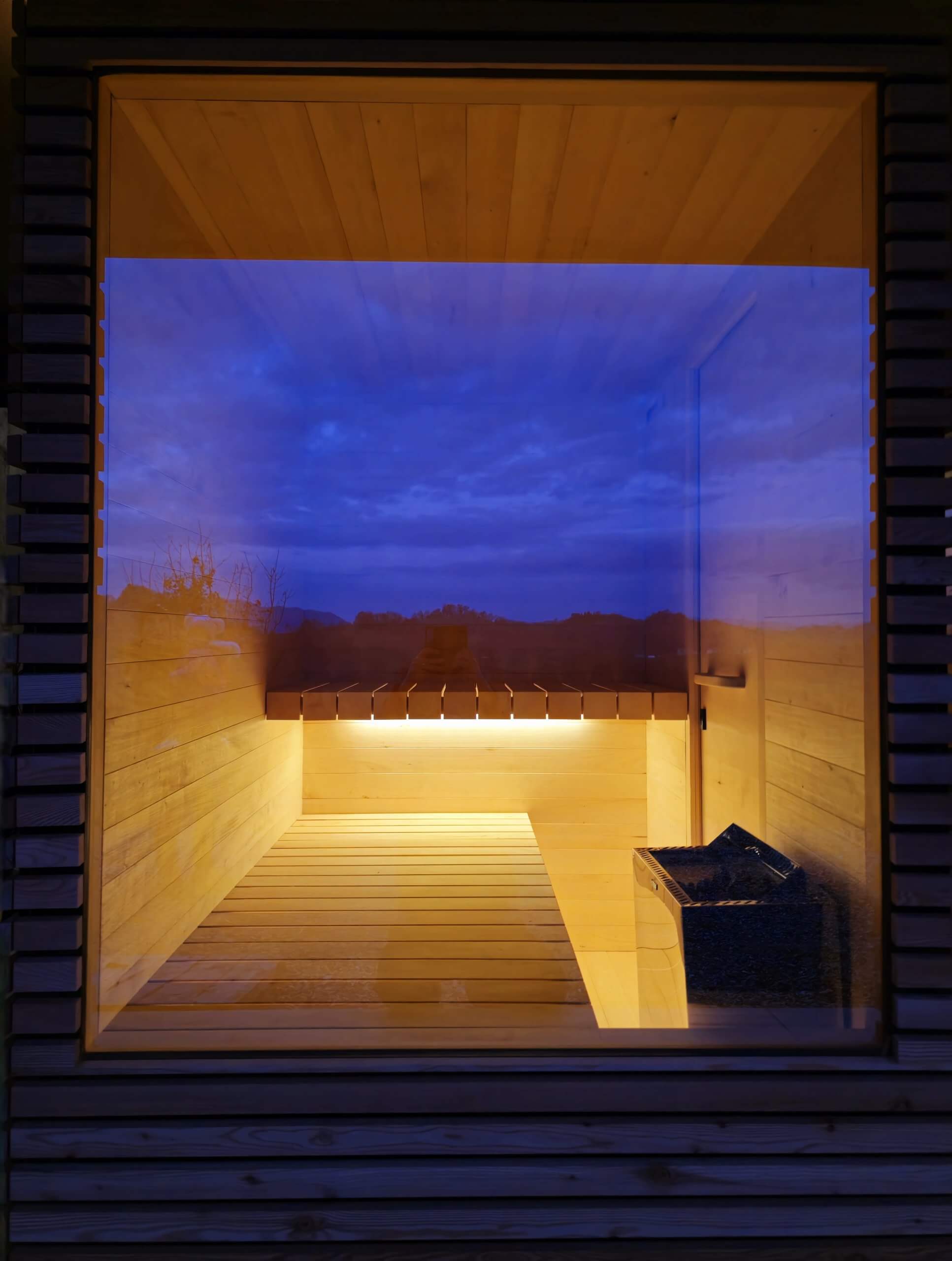 Choose between indoor or outdoor versions, finished with solid wood panels in lime, alder, or thermo ash, and clear or bronze-tinted glass. The subtle LED lighting behind the backrest creates a warm, luxurious atmosphere, while the Harvia Wi-Fi or touchscreen control allows you to easily adjust temperature and lighting – directly from your smartphone.